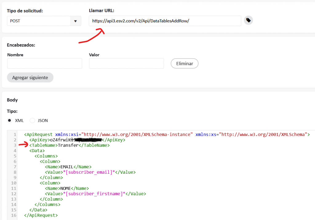 Este es el enlace de la documentación de donde se sacó el XML utilizado: https://sites.google.com/expertsender.com/api-documentation-v2/methods/data-tables/add-row